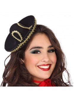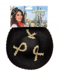 Mini palarie mexicana/ sombrero pentru adulti, din fetru negru accesorizat cu snur auriu, 100% poliester, prindere cu 2 clipsuri metalice.