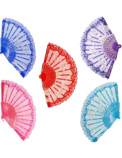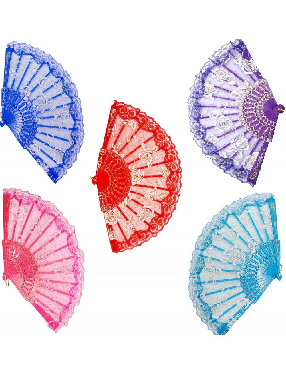 Evantai din dantela, cu trandafiri aurii, din material textil (100% poliester) si maner din plastic, lungime totala 23 cm, culori: rosu, mov, albastru deschis, albastru inchis, fucsia