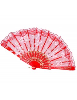 Evantai din dantela, cu trandafiri aurii, din material textil (100% poliester) si maner din plastic, lungime totala 23 cm, culori: rosu, albastru, negru, roz deschis, roz inchis.