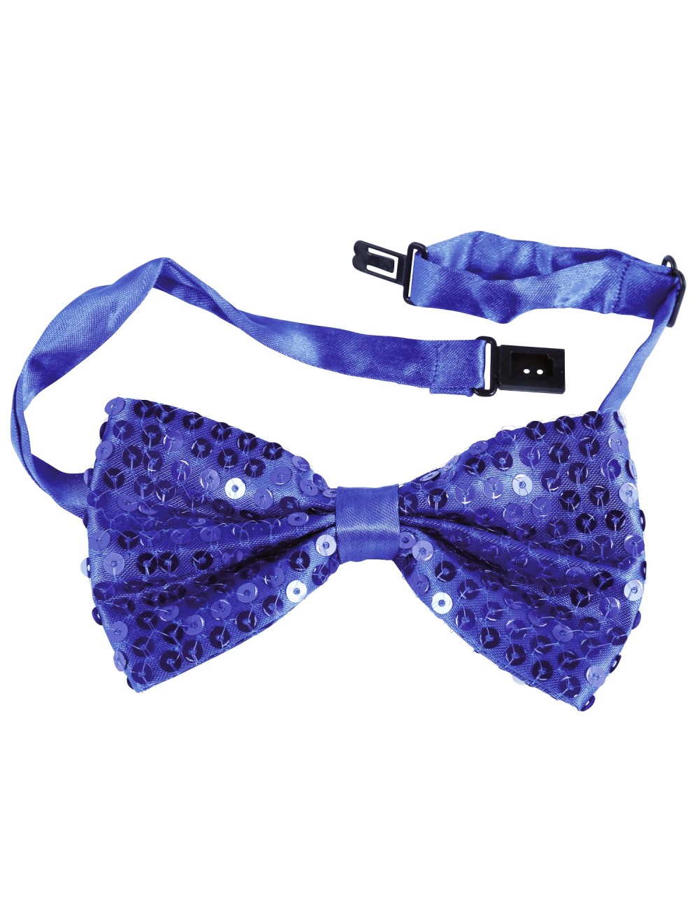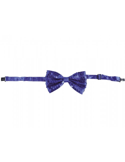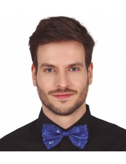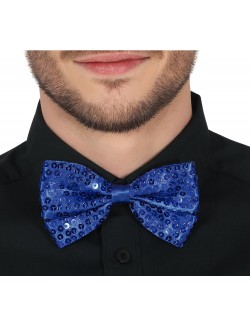 Papion albastru cu paiete, lungime 12 cm, stralucitor, prindere cu banda reglabila din satin si cu inchizatoare la spate, 100% poliester.