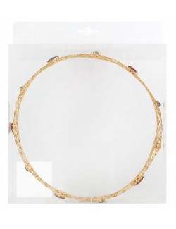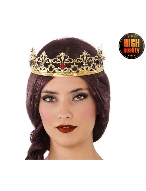 Coroana regala aurie, din metal, decorata cu pietre multicolore, diametru 18 cm, circumferinta 58,5 cm, inaltime 6 cm.