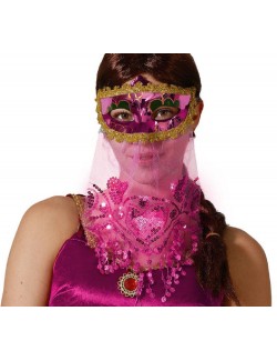 Masca araba din plastic, cu voal din tul, culoare fucsia cu garnitura aurie, accesorizat cu paiete, prindere la spate cu panglici.