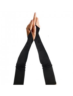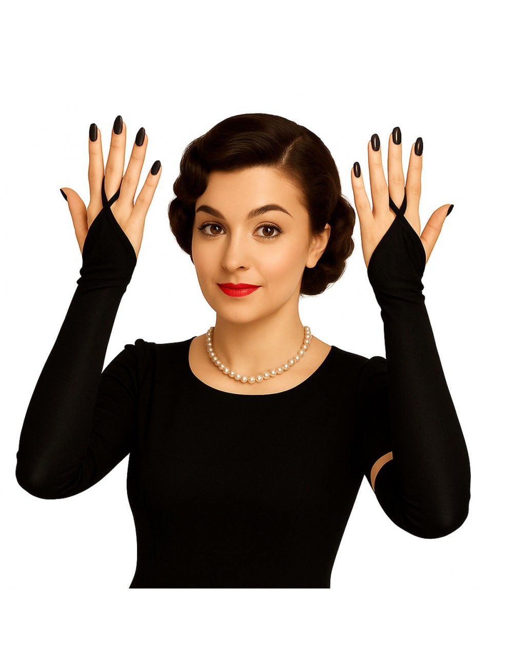 Manusi negre, fara degete, lungime 48 cm, pentru adulti, confectionate din satin - 100% poliester, accesoriu elegant pentru carnaval si petreceri.