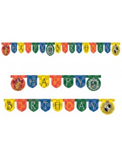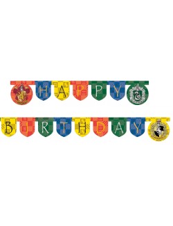 Ghirlanda decor, Harry Potter Hogwarts Houses, lungime totala de 200 cm, din carton imprimat pe o singura parte cu blazoanele Hogwarts: Gryffindor, Slytherin, Ravenclaw si Hufflepuff.