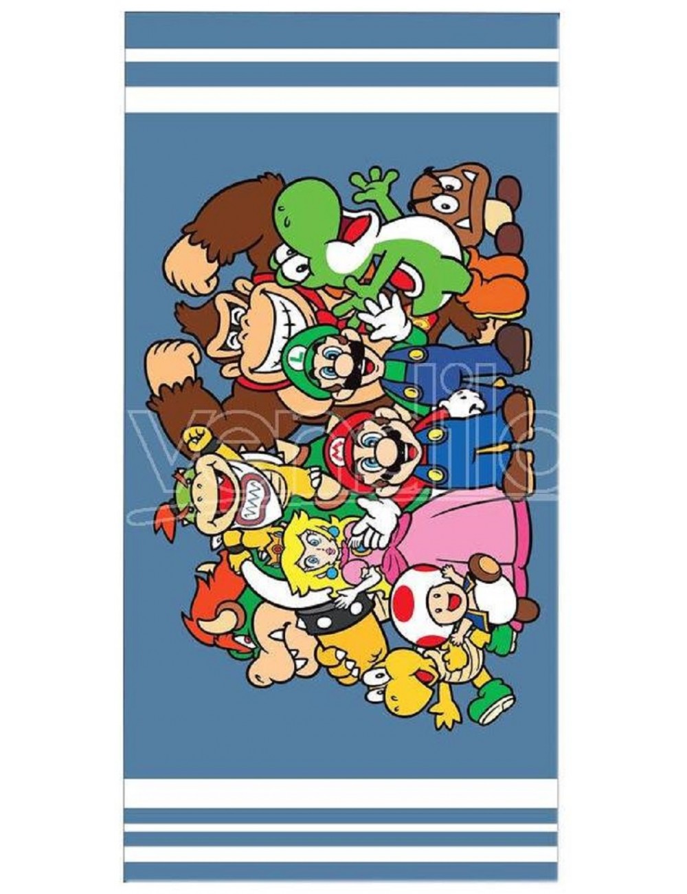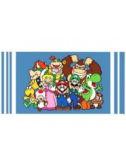Prosop plaja Super Mario Team, dimensiuni 140 x 70 cm, 100% bumbac, 320 gr/mp, fond albastru cu imprimeu multicolor.