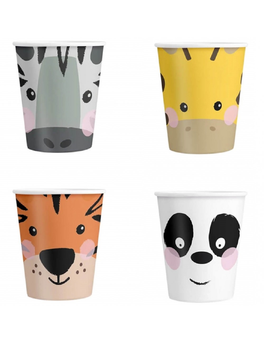 Set 4 pahare Safari Jungla party, 200 ml, din carton, de unica folosinta, multicolore, imprimate cu: panda, tigru, zebră și girafă..