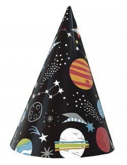 Set 6 coifuri petrecere, Spatiu cosmic - Outer Space, din carton, prindere cu elastic, inaltime 15 cm, diametru 11 cm