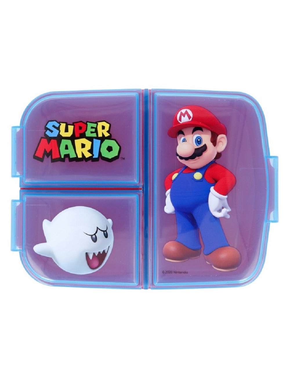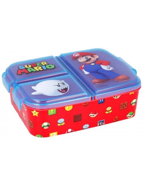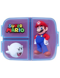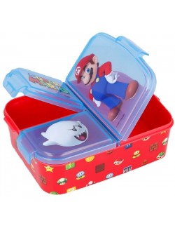Cutie pentru alimente, Super Mario, cu 3 compartimente, dimensiuni 19,5 x 16,5 x 6,7 cm, capac tranparent, imprimat, material plastic.