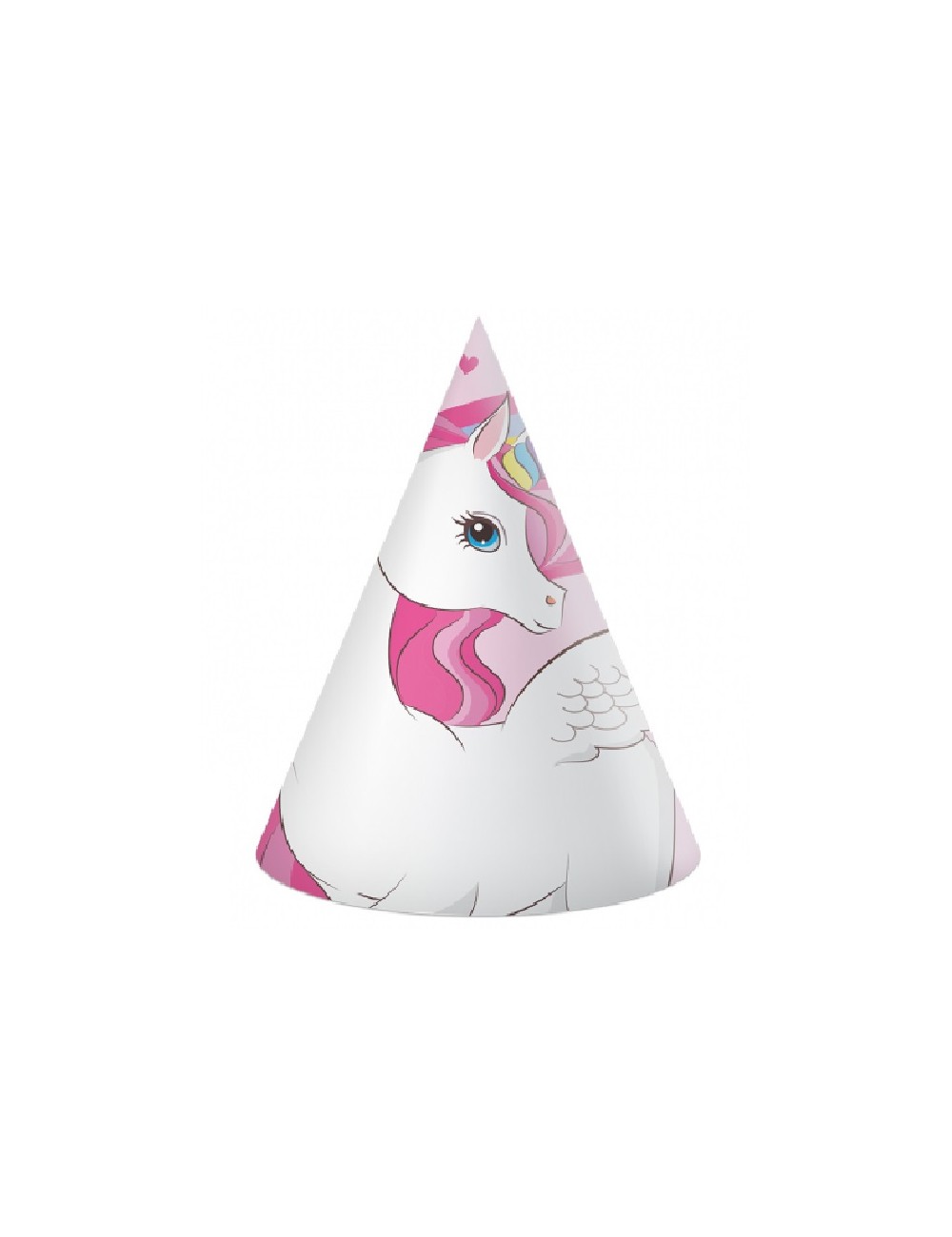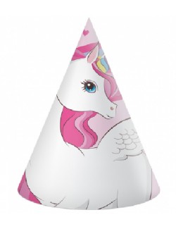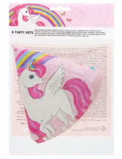 Set 6 coifuri party, Unicorn Rainbow, din carton, prindere cu snur, inaltime 16 cm, diametru 12 cm.