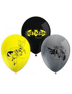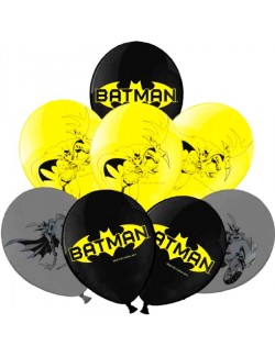 Set 8 baloane latex, Batman, 30 cm, culori asortate: negru, galben si gri, imprimate cu indragitul super-erou si logo-ul Batman.