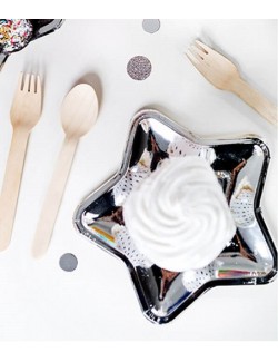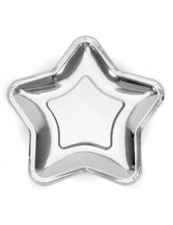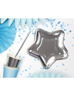Set 6 farfurii, Stea argintie, diametru 18 cm, de unica folosinta, fabricate din carton acoperit cu folie metalizata argintie.
