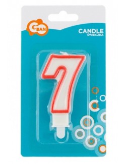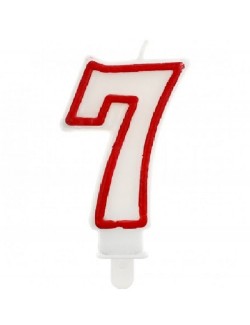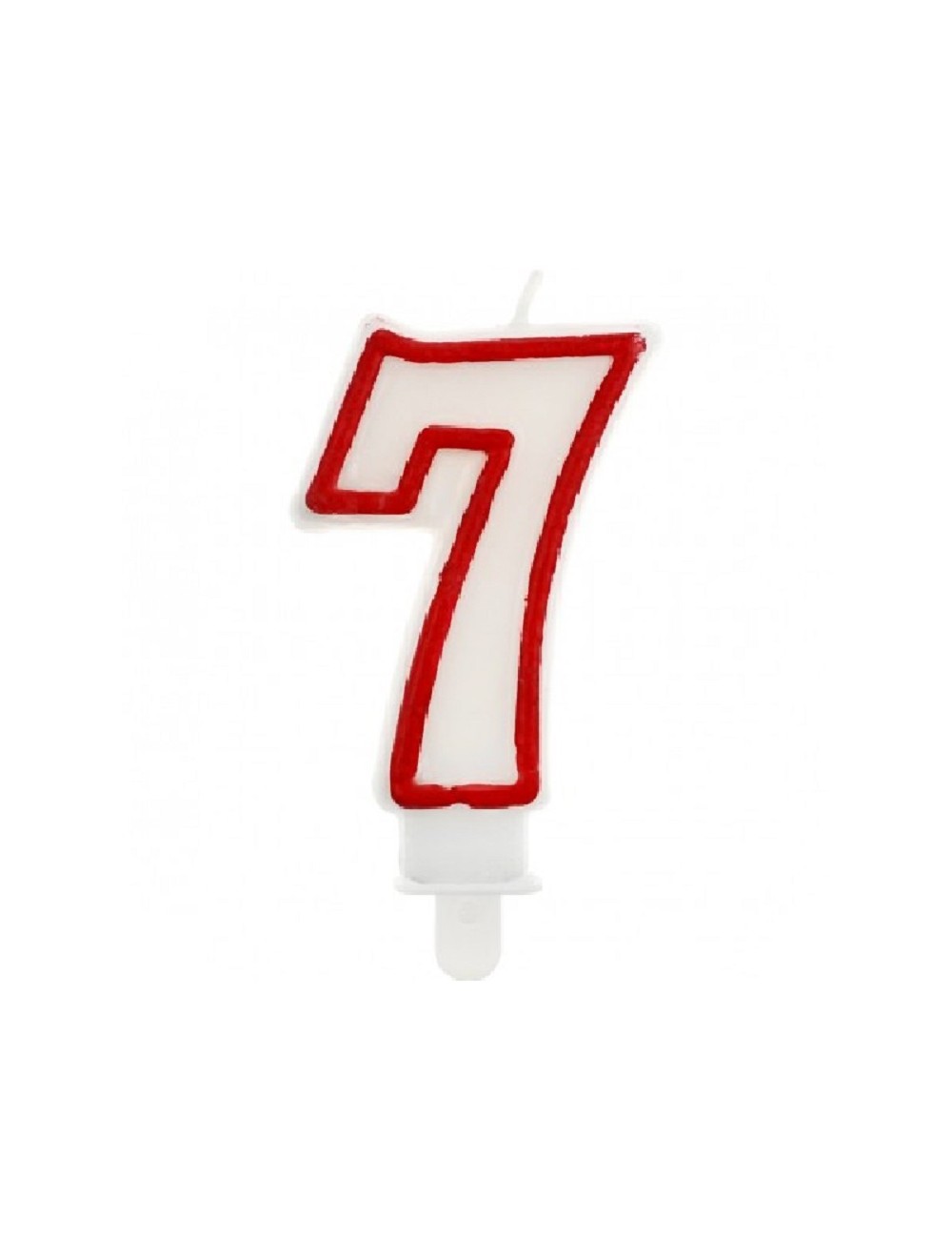 Lumanare tort, Cifra 7, culoare alba cu chenar rosu, din parafina cu suport de plastic, perfecta pentru petreceri aniversare.