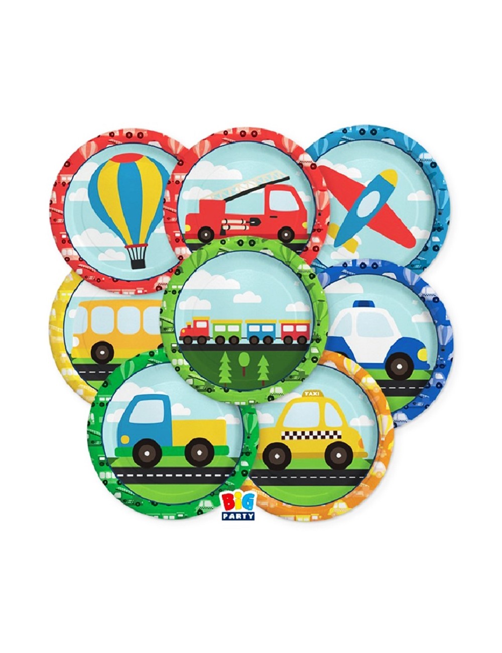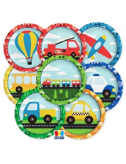 Set 8 farfurii petrecere, Vehicule, diametru 18 cm, fabricate din carton, fara plastic, multicolore, imprimate cu diverse mijloace de transport.