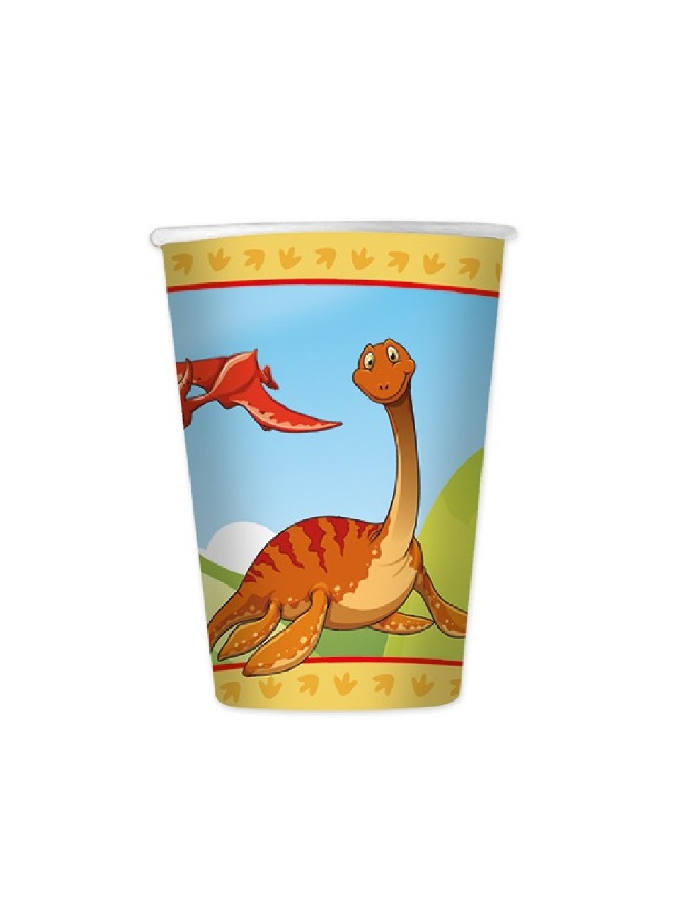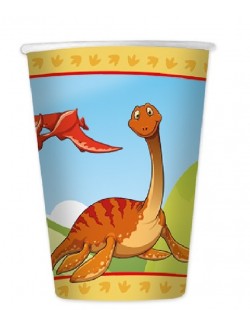 Set 8 pahare Baby Dino, 200 ml, de unica folosinta, imprimate cu dinozauri din diverse specii, fabricate din carton.