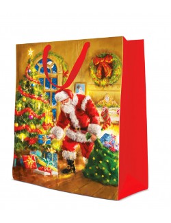 Punga pentru cadouri Mos Craciun - Santa is here, dimensiuni 40x30x12 cm, din hartie, imprimeu multicolor, identic pe cele 2 parti.