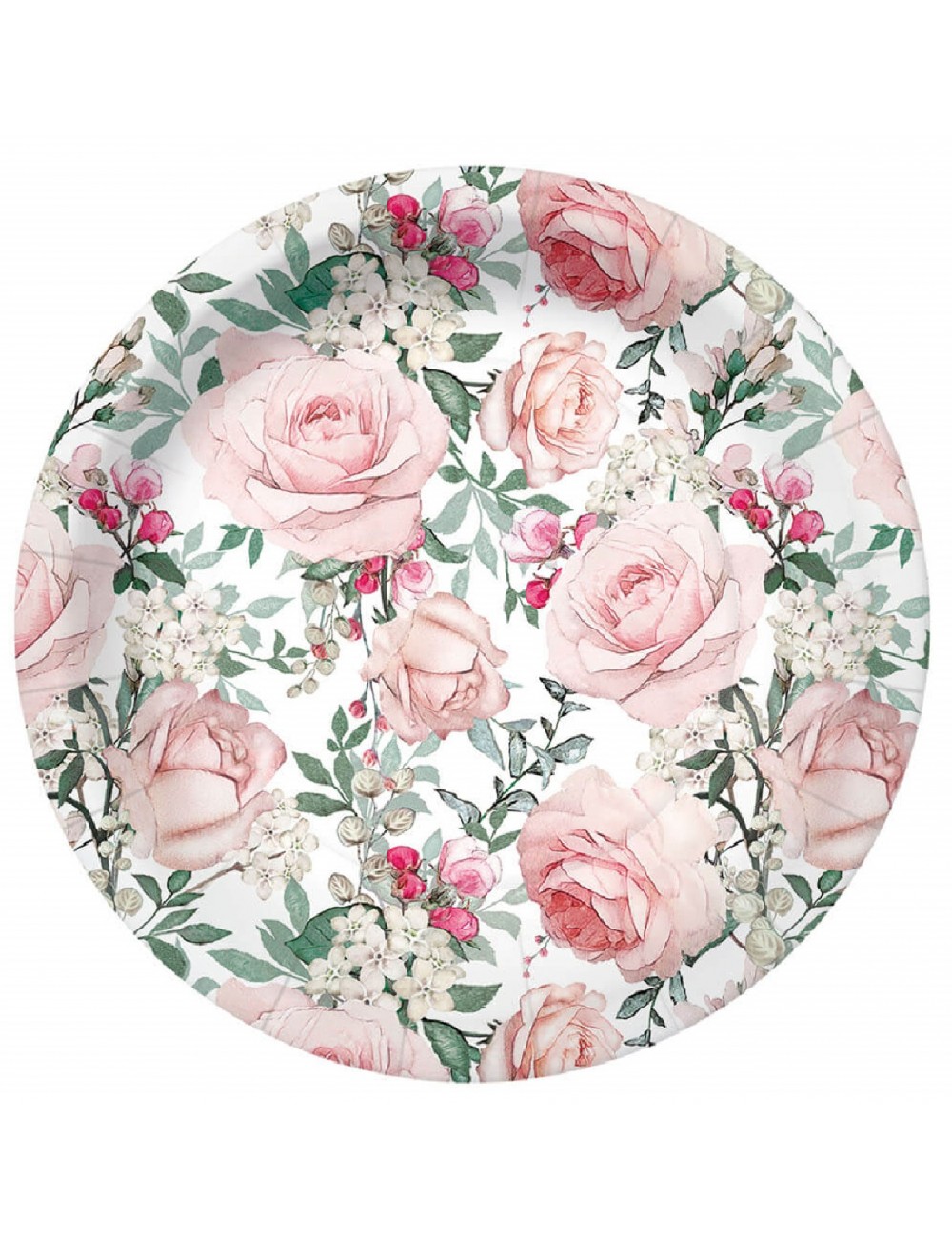 Set 10 farfurii desert, Trandafiri roz, diametru 18 cm, de unica folosinta, fabricate din carton, nu contin plastic.