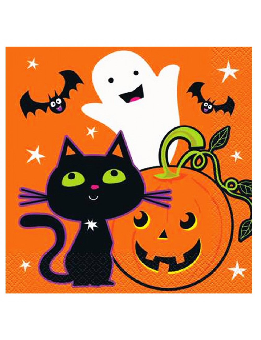 Set 16 servetele Halloween Friends, dimensiuni 33 x 33 cm (extins), din 2 straturi de hartie fina, perfecte pentru petrecerea de Halloween.