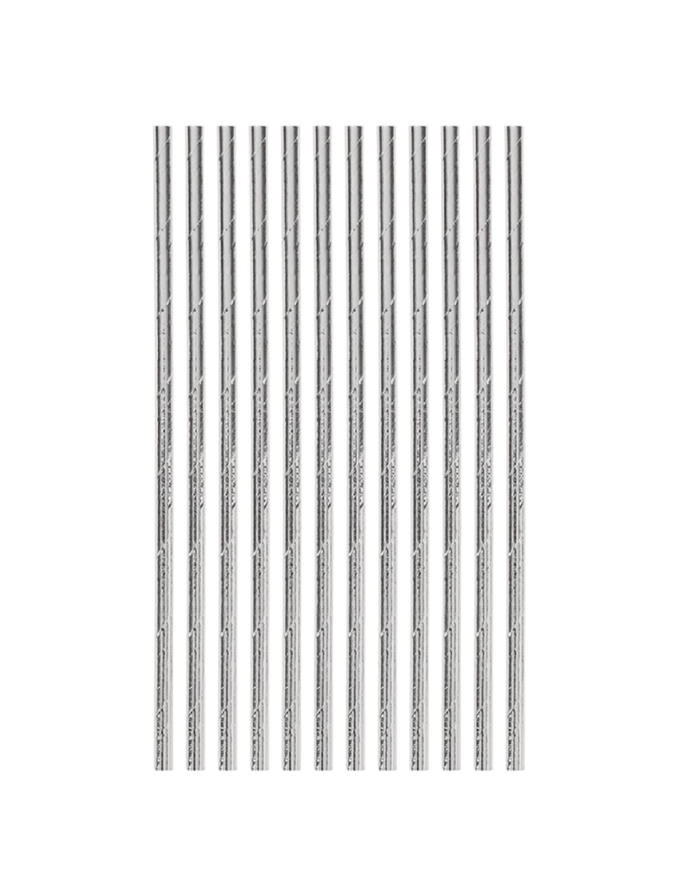 Set 12 paie argintii, lungime 20 cm, din carton cu folie metalica, pentru bauturi reci.