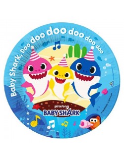 Set 8 farfurii Baby Shark, diametru 18 cm, de unica folosinta, fabricate din carton, fara plastic, culori intense si frumoase.
