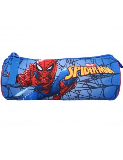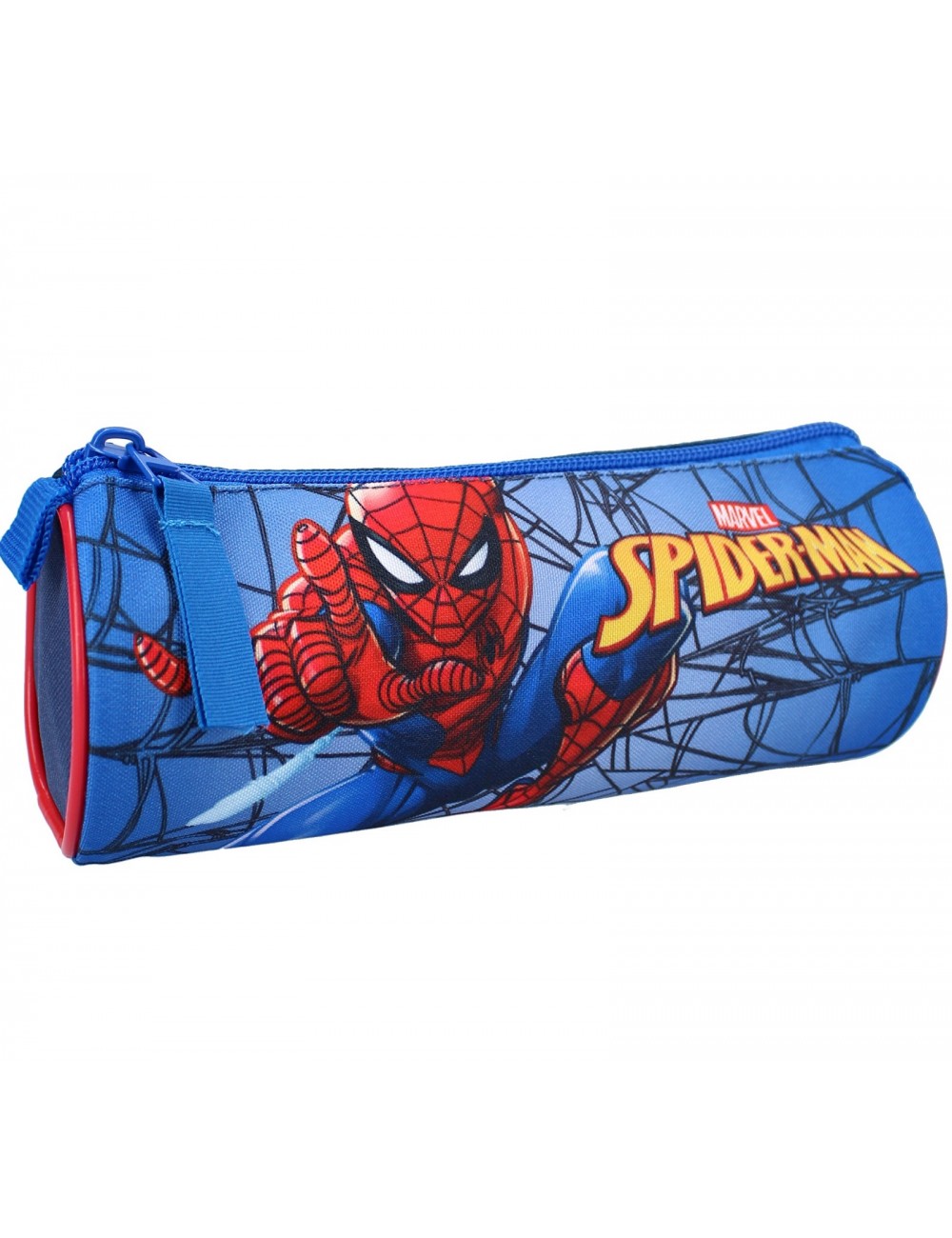 Penar cilindric, Spiderman, dimensiuni 21 X 7 cm, culoare albastra, inchidere cu fermoar, imprimat cu indragitul supererou.