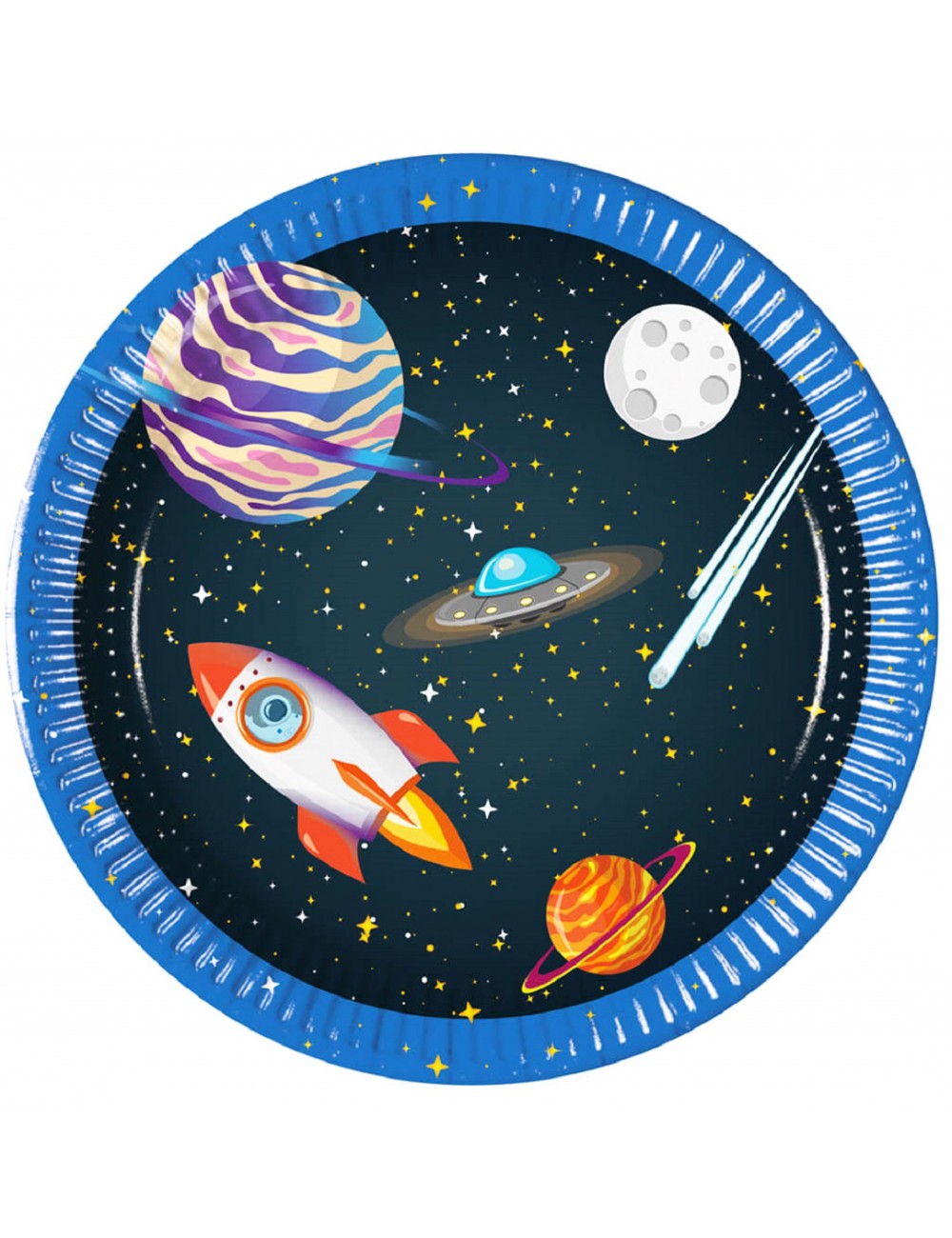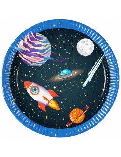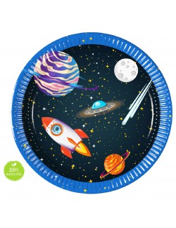Set 8 farfurii Rocket Space, diametru 20 cm, de unica folosinta, fabricate din carton, fara plastic, imprimate cu o frumoasa imagine din spatiul cosmic.