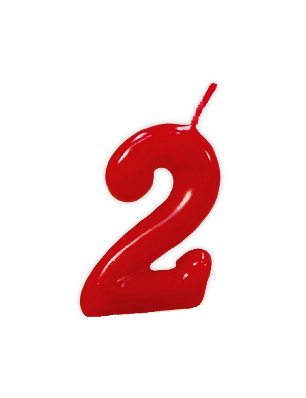 Lumanare rosie, Cifra 2, fabricata din parafina, inaltime lumanare - aprox. 5,5 cm, fixata pe un suport din plastic.