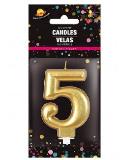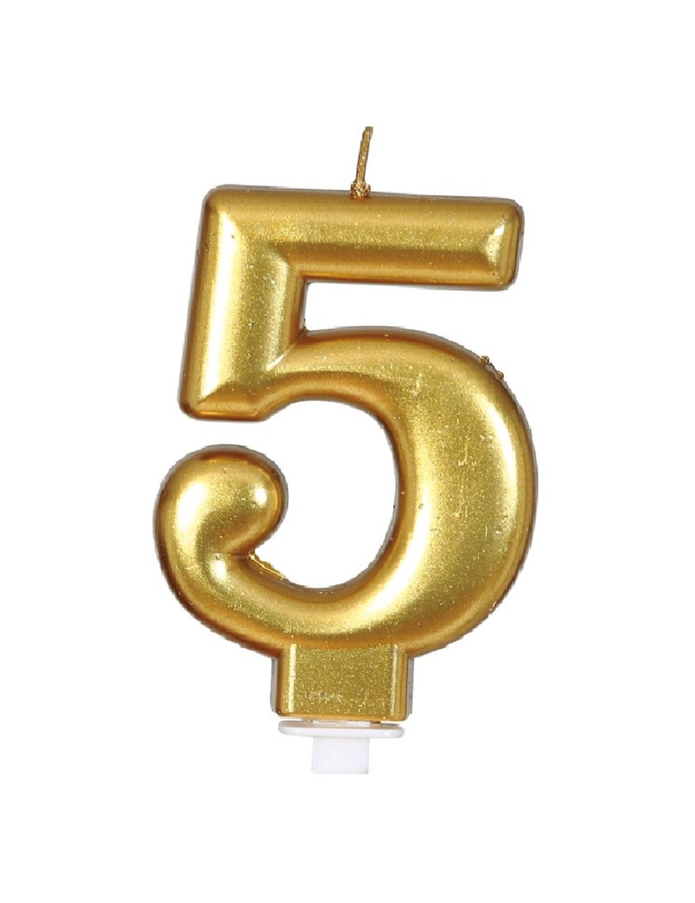 Lumanare aurie, Cifra 5, fabricata din parafina, inaltime lumanare - aprox. 8 cm, fixata pe un suport din plastic.