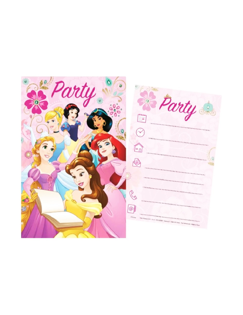 Set 5 Invitatii petrecere Printese Disney, din carton imprimat, insotite de 5 plicuri albe.