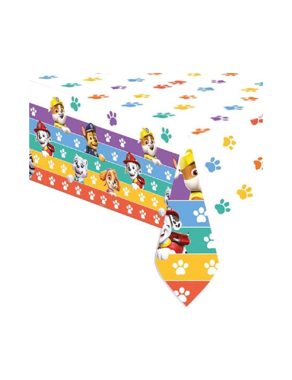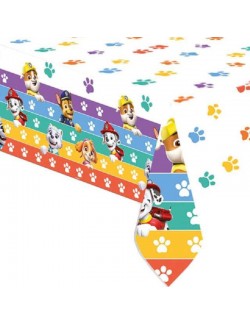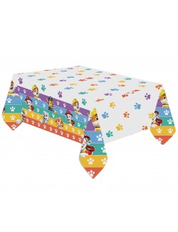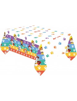Fata de masa Patrula catelusilor, 120x180 cm, culori rosu-albastru, fabricata din plastic rezisent, imprimata cu catelusii Chase, Skye, Marshall si Rubble.