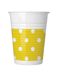 Set 8 pahare plastic, galbene cu buline albe, capacitate 200 ml, de unica folosinta, pentru petreceri.