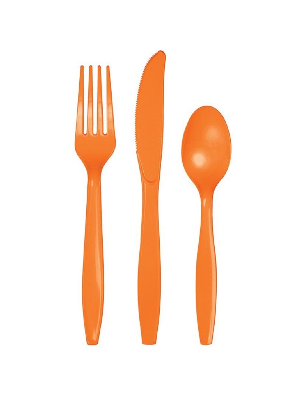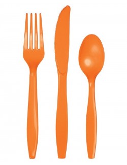 Set 24 tacamuri portocalii, Premium Orange, din plastic rezistent, reutilizabile, contine 8 furculite (18 cm), 8 cutite (19 cm) si 8 lingurite (16 cm).