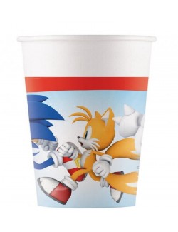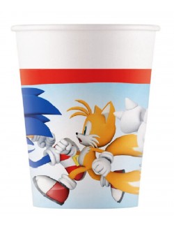 Set 8 pahare Ariciul Sonic, capacitate 200 ml, din carton ecologic, de unica folosinta, imprimate cu Sonic, Tails si Knuckles.