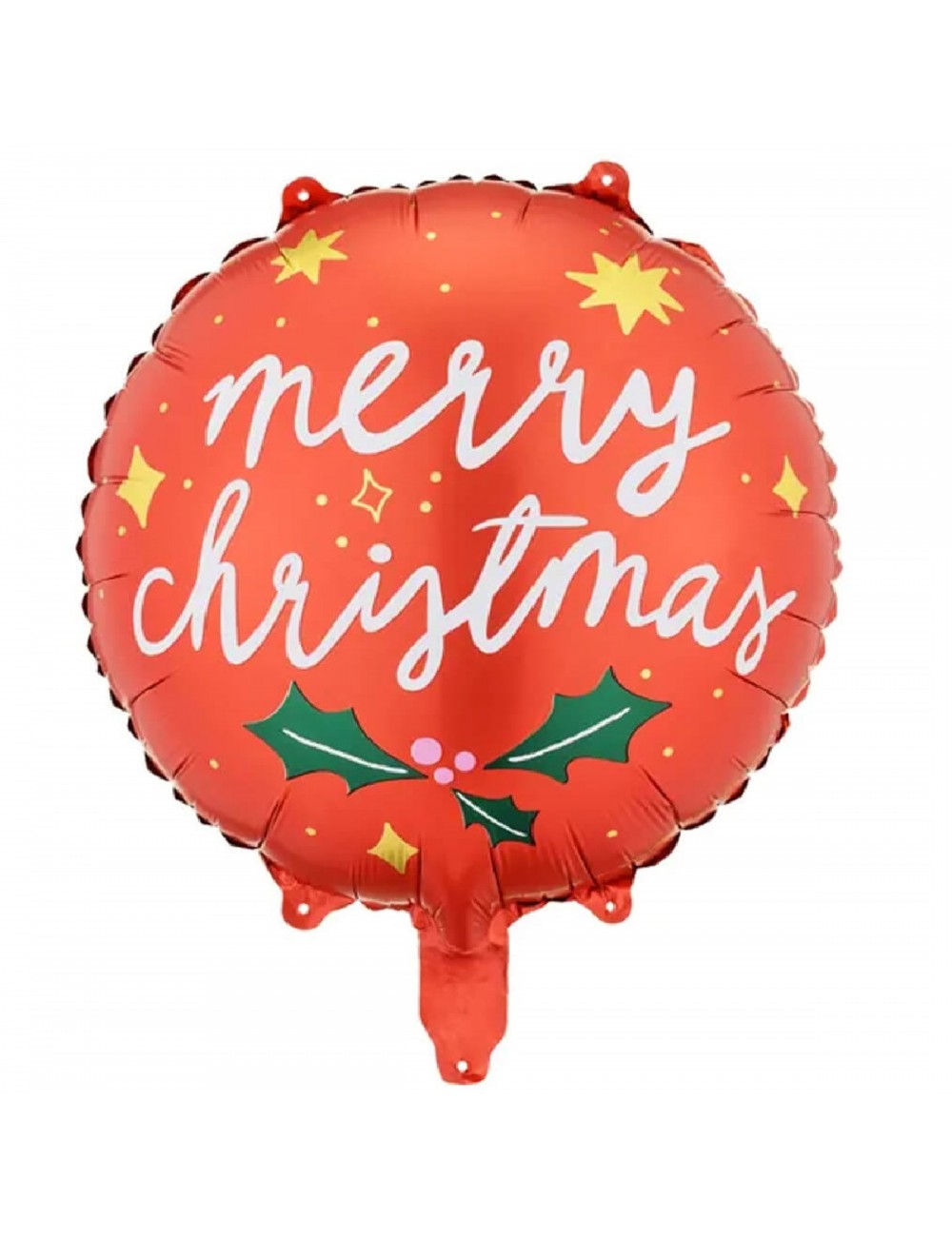 Balon folie rosu, Merry Christmas, diametru 45 cm (dezumflat), imprimeu identic pe ambele parti, poate fi umflat cu aer (nu pluteste) sau cu heliu (pluteste).