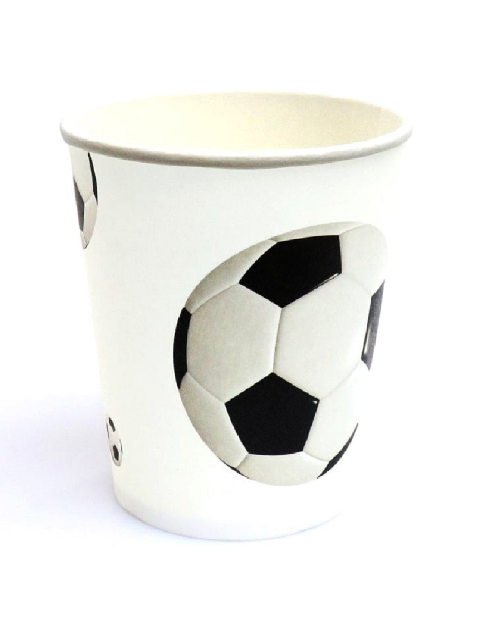 Set 6 pahare carton, Minge Fotbal, 250 ml, de unica folosinta, din carton, nu contin plastic, culoare alba, imprimate cu mingi de fotbal de diferite dimensiuni.