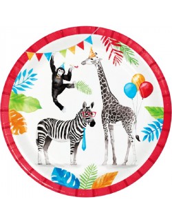 Set 8 farfurii Animals - Jungle party, de unica folosinta, fond alb cu imprimeu multicolor, fabricate din carton, diametru 22 cm.