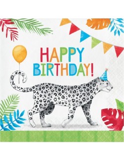 Set 16 servetele Animals Jungle party, dimensiuni 33 x 33 cm (extins), din 2 straturi de hartie, fond alb, imprimeu multicolor.