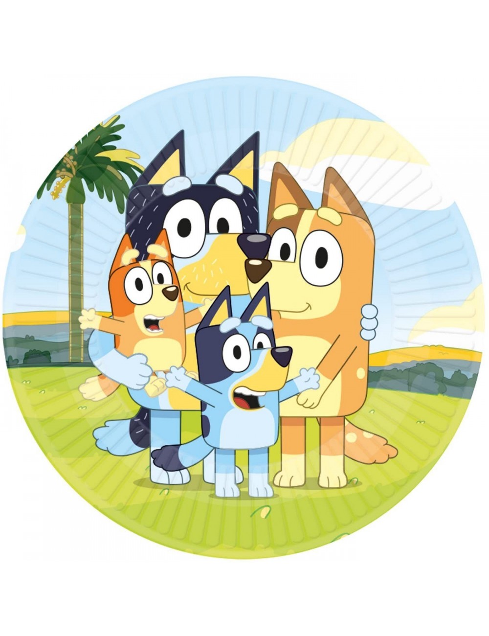 Set 8 farfurii Bluey Family, diametru 23 cm, de unica folosinta, fabricate din carton, nu contin plastic, imprimeu cu Bluey, Bingo si parintii lor.