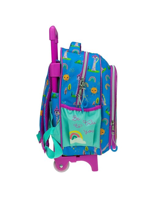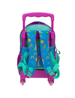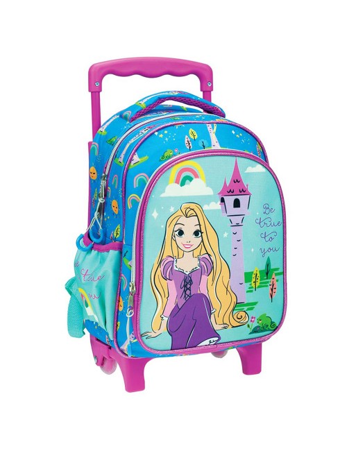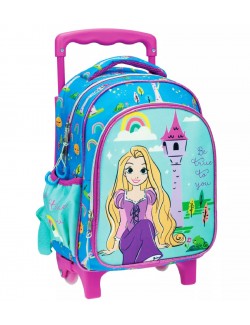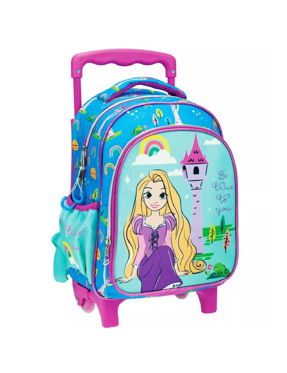 Ghiozdan troler Printesa Rapunzel, dimensiuni 30 x 25 x 15 cm, are un compartiment incapator si un buzunar frontal inchise cu fermoar, buzunare laterale si maner, este potrivit pentru gradinita.