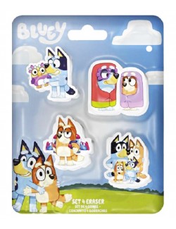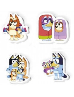 Set 4 Radiere Bluey Family, dimensiuni aprox. 4,5 x 4 cm, ambalate intr-un blister cu dimensiunile 16 x 12 cm.