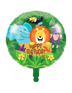 Balon folie Party Jungle Safari, rotund, diametru de 46 cm, imprimeu multicolor cu animalute simpatice, identic fata-verso.