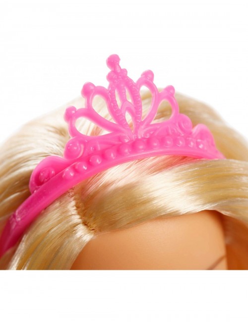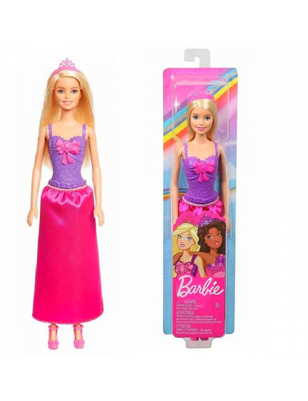 Papusa Barbie, blonda, inaltime 30 cm, culori mov-fucsia, fabricata din plastic.