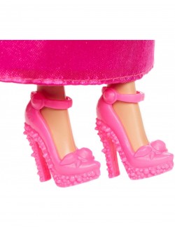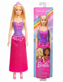Papusa Barbie, par blond, inaltime 30 cm, vestimentatie si accesorii culori mov-fucsia, fabricata din plastic.