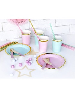 Set 6 farfurii light mint cu garnitura aurie, diametru 18 cm, de unica folosinta, din carton, nu contin plastic.
