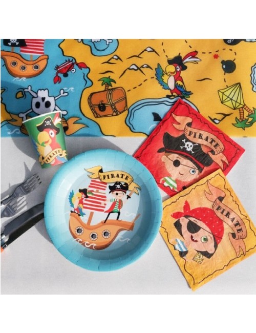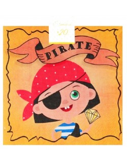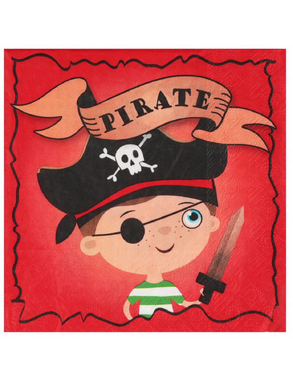 Set 20 servetele Pirati, rosu-galben, dimensiuni 33x33 cm (extins), din 2 straturi de hartie, culori si imprimeuri diferite pe cele doua parti..