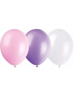 Set 10 baloane Roz, Mov, Alb perlat, diametru 28 cm, din latex-cauciuc natural, biodegradabile, pot fi umflate cu aer sau cu heliu.