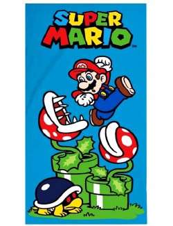 Prosop plaja Super Mario, dimensiuni 140 x 70 cm, 100% bumbac, densitate 315 gr/mp, culoare albastra, imprimeu multicolor.