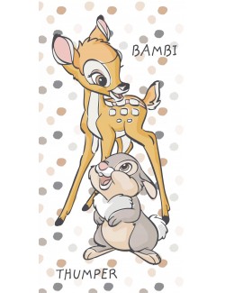 Prosop plaja Bambi si Bocanila, dimensiuni 70 x 140 cm, bumbac 100%, imprimat cu indragitul pui de caprioara Bambi si prietenul sau.
