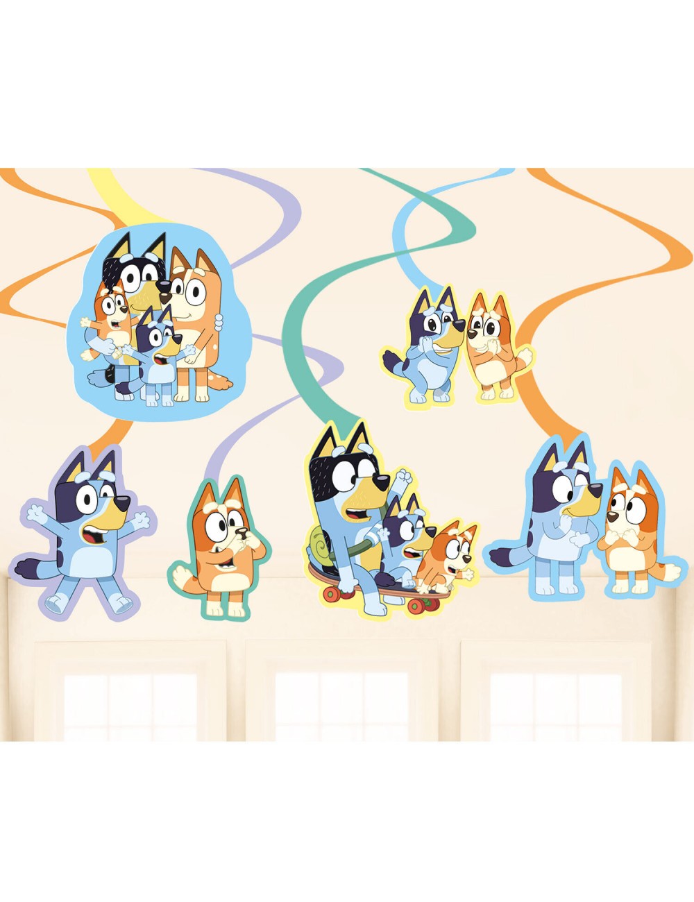 Set 6 decoratiuni suspendate, Bluey Family, lungime aprox. 60 cm, cu spirale din hartie de care sunt atasate medalioane din carton cu imaginea familiei Heeler.