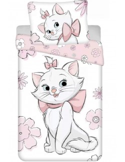 Lenjerie de pat Pisicuta Marie Flowers, 140 X 200 cm, alcatuita din 2 piese: o fata de perna (70x90 cm) si un cearceaf pentru pilota (140x200 cm), imprimeu diferit pe cele 2 fete, inchidere cu fermoar, bumbac 100%.