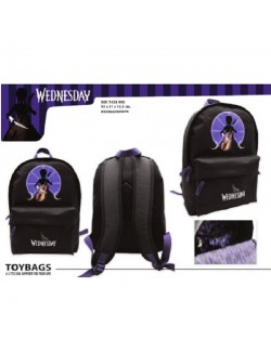 Ghiozdan Wednesday Addams, dimensiuni 43x31x14 cm, cu un compartiment principal si un buzunar frontal, compartiment pentru laptop, interior captusit si personalizat, spate si bretele captusite.